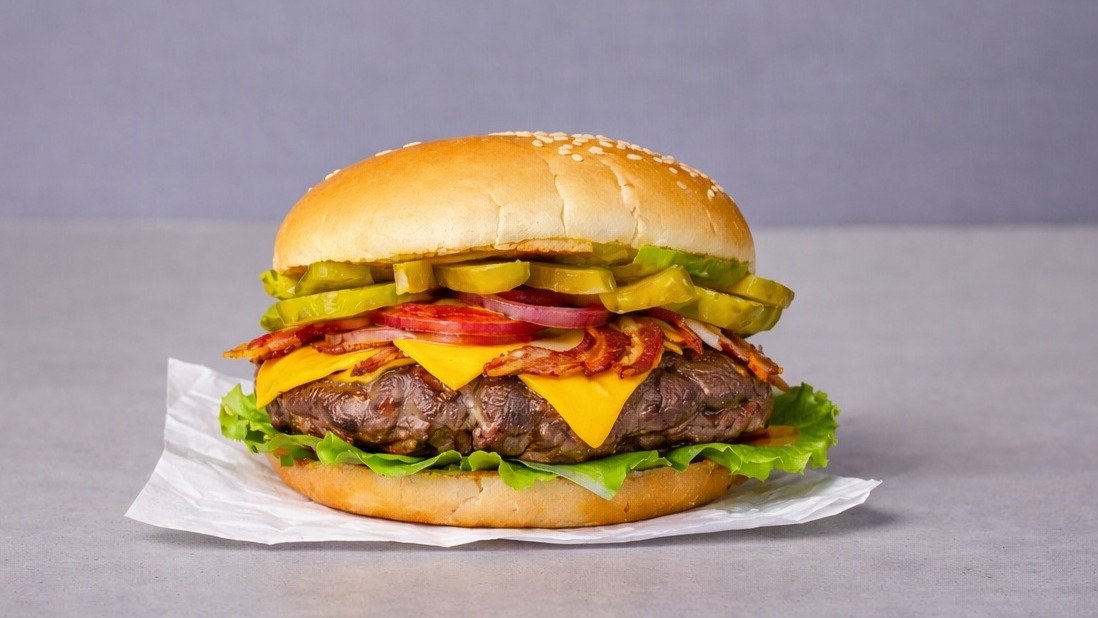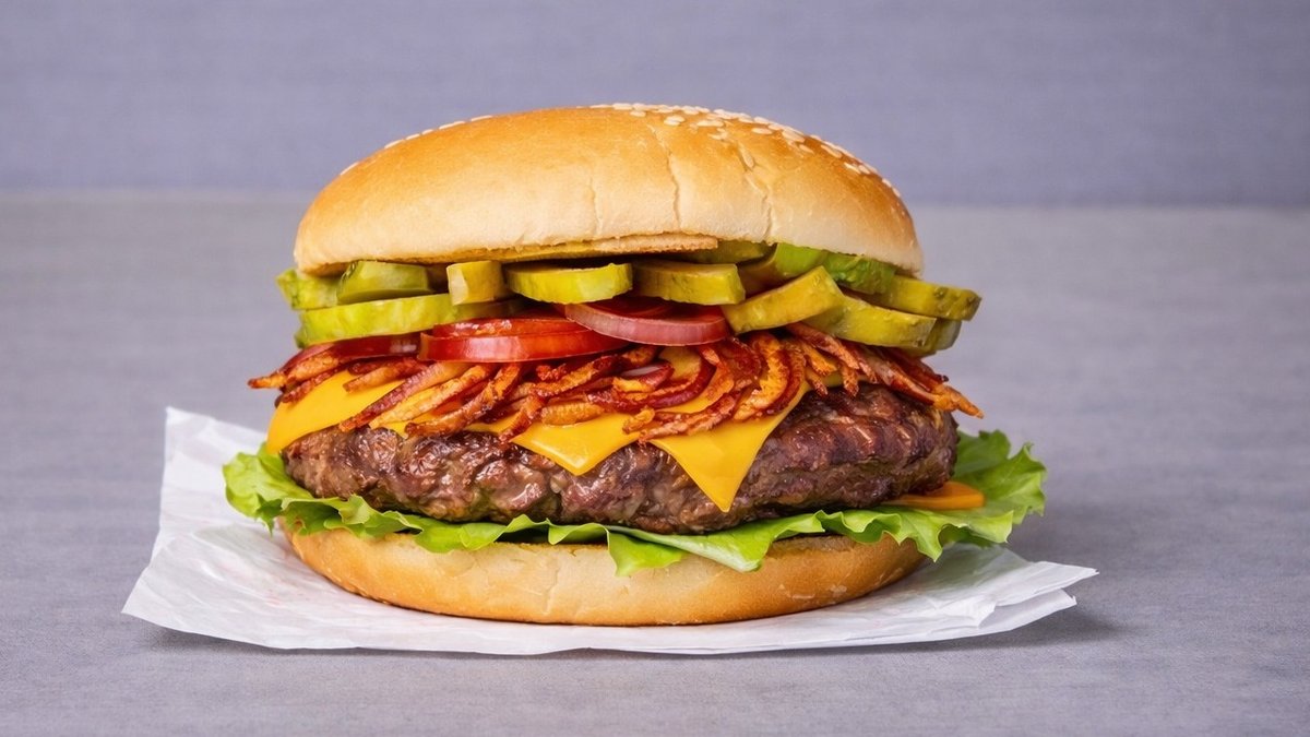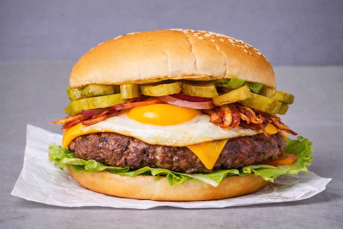 1x125 g pihvi, juusto, salaatti, kananmuna, pekoni, tomaatti, kurkku, ranskalaiset, 0,33l juoma