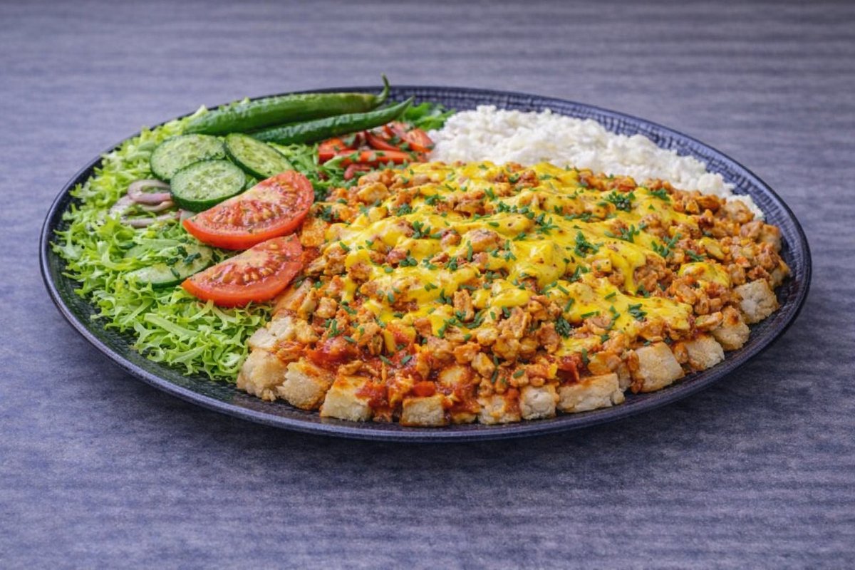Leipäkuutioita, jogurtti, kebabliha, salaatti, kastike