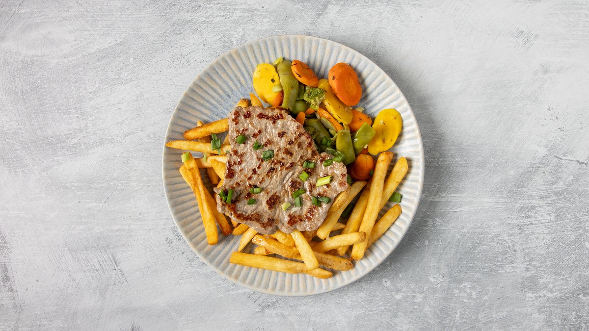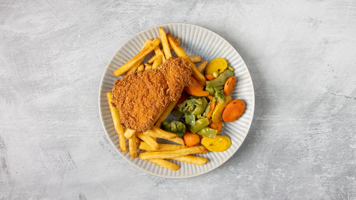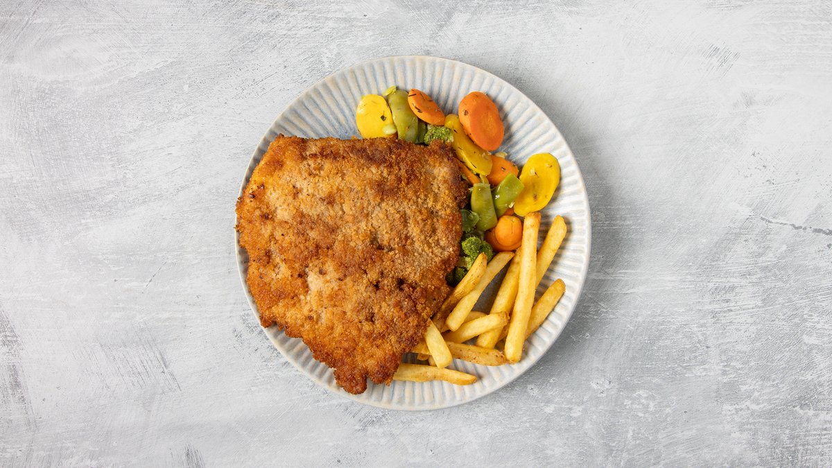 Maalaisranskalaiset, paneroitu porsaanleike (160g), lämmin kasvikset ja valitsemasi kastike
