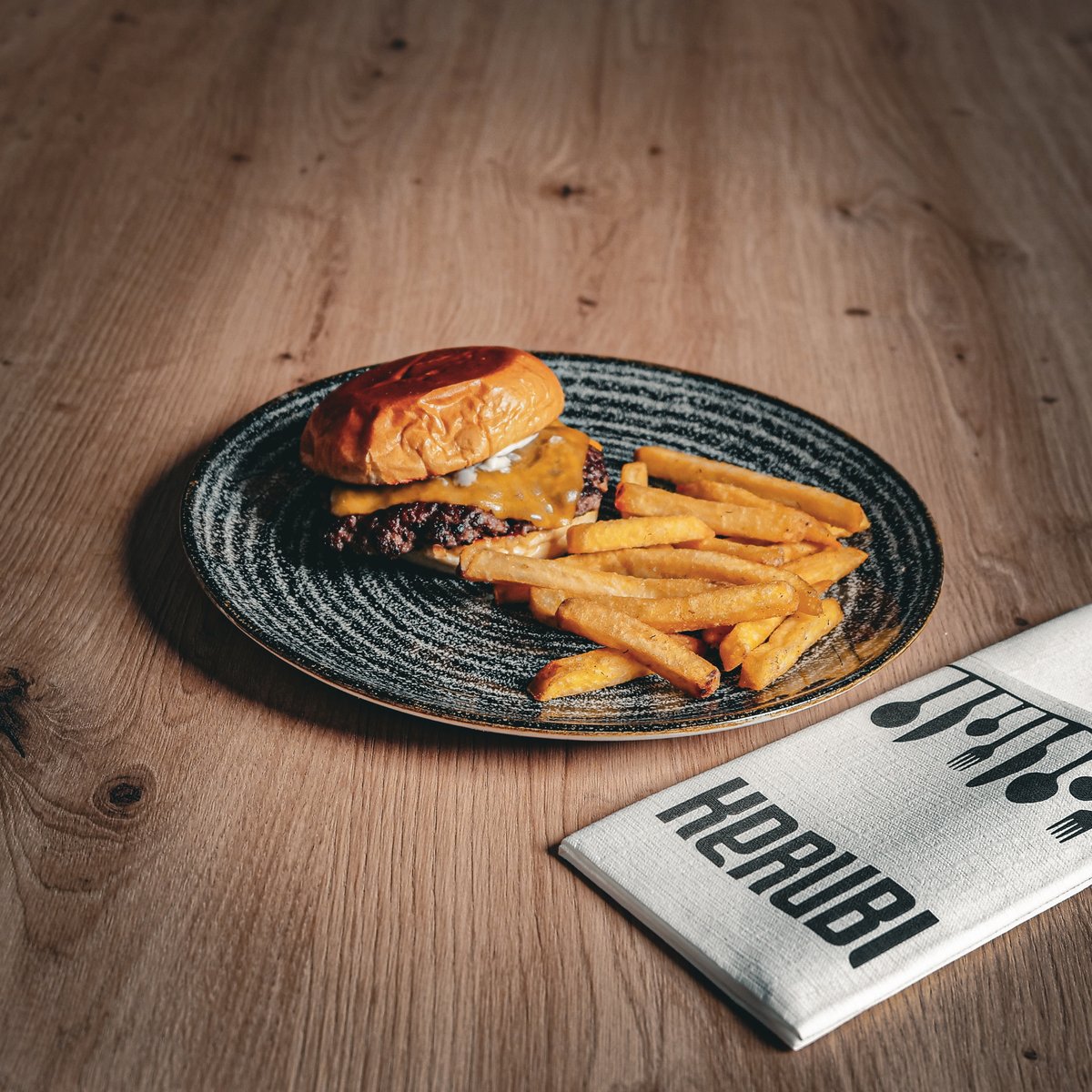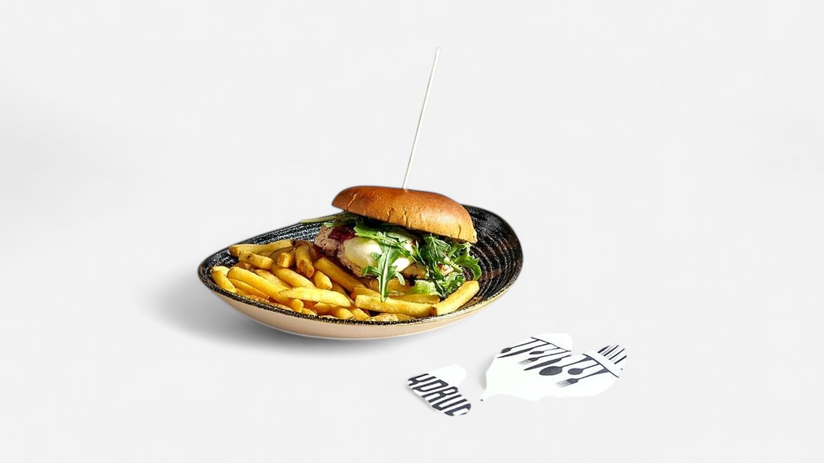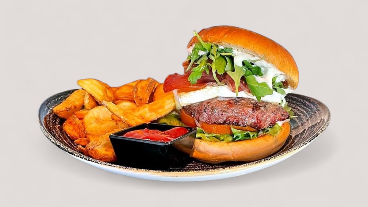 Briossi sämpylä, naudan smash pihvi, cheddarjuusto, hellmans majoneesi ja maustettuja maalaisranskaisia