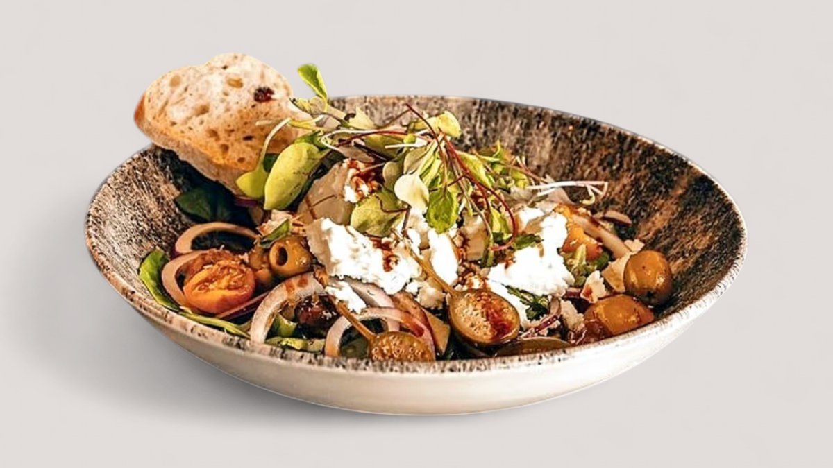 Kerubin seitania, vihreää salaattia, lehtikaalia, marinoitua spelttiä ja kvinoaa, paahdettua talvikurpitsaa, fetamurua, kurkkua, granaattiomenan siemeniä, vattupahishilloa ja talon focacciaa