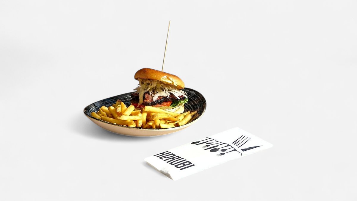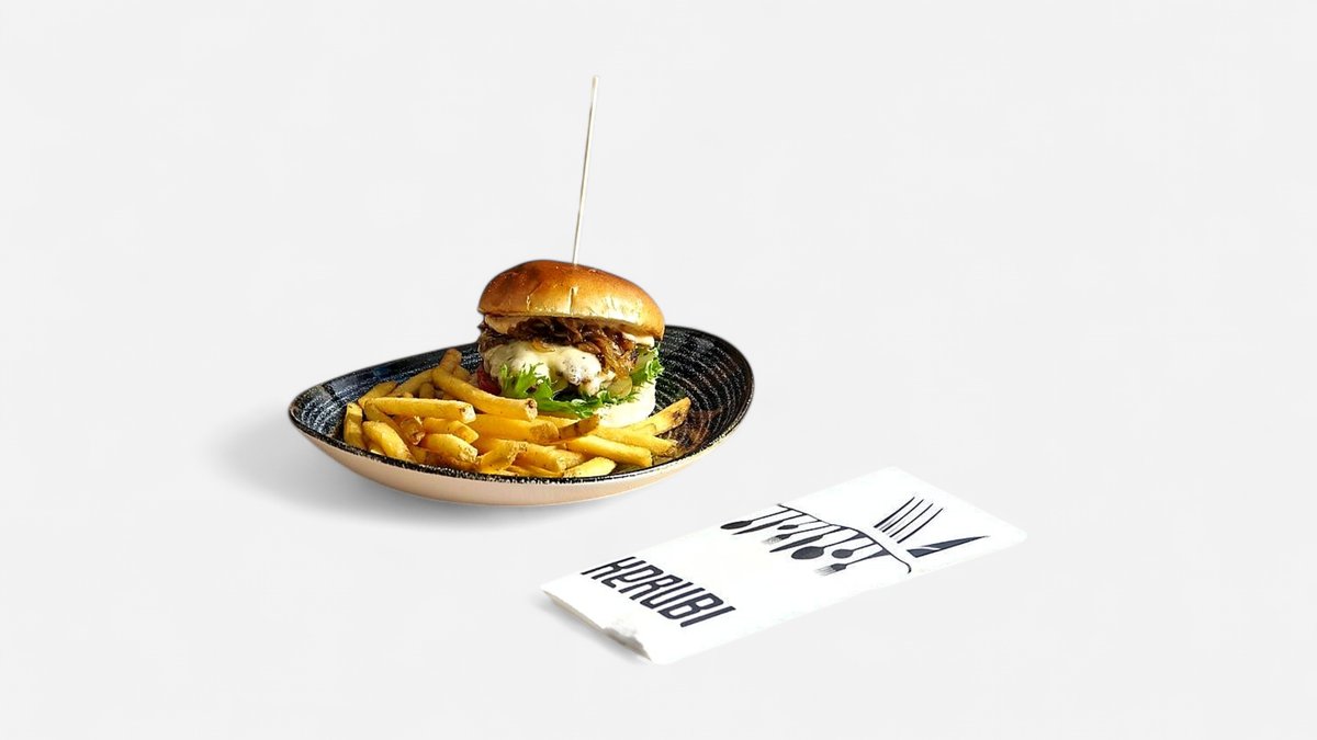 Briossisämpylä, grillattu tuore 160 g häränpihvi, karamellisoitua sipulia, Monterey Jack -juustoa, Myrttisen valkosipulisuolakurkkua, Kerubin Boom Boom -kastiketta, salaattia, pihvitomaattia ja maustettuja maalaisranskalaisia