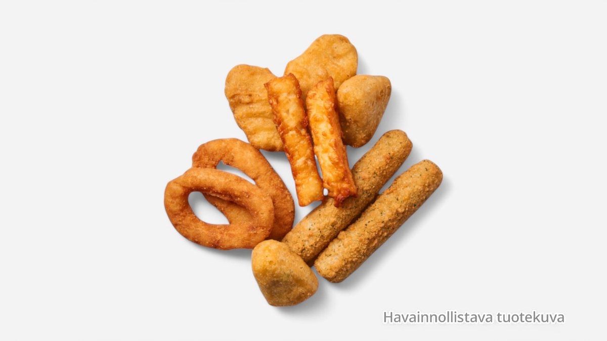 7 Kpl sipulirenkaat, 3 kpl nugetit, 3 kpl mozzarellatikut, 3 kpl mozzarellalla täytetyt jalapenot, ristikkoperunat, neljä erilaista dippiä.