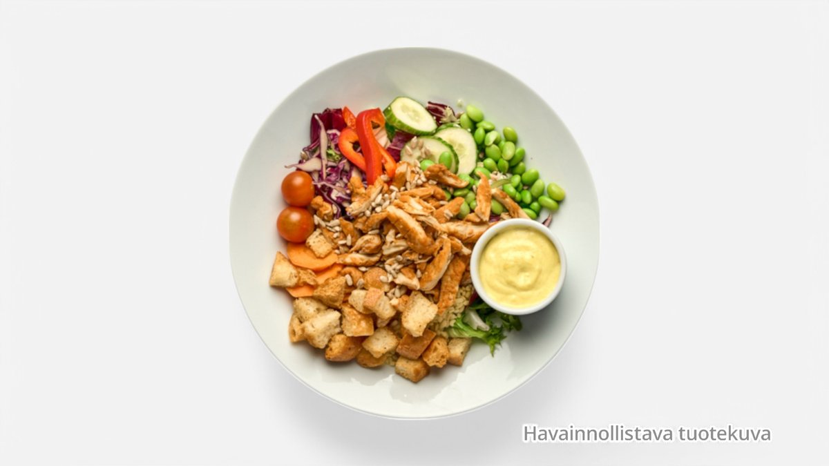 Kananliha, jäävuorisalaatti, tuore kurkku, tuore tomaatti, salaattijuusto, rucola, tuorepaprika
