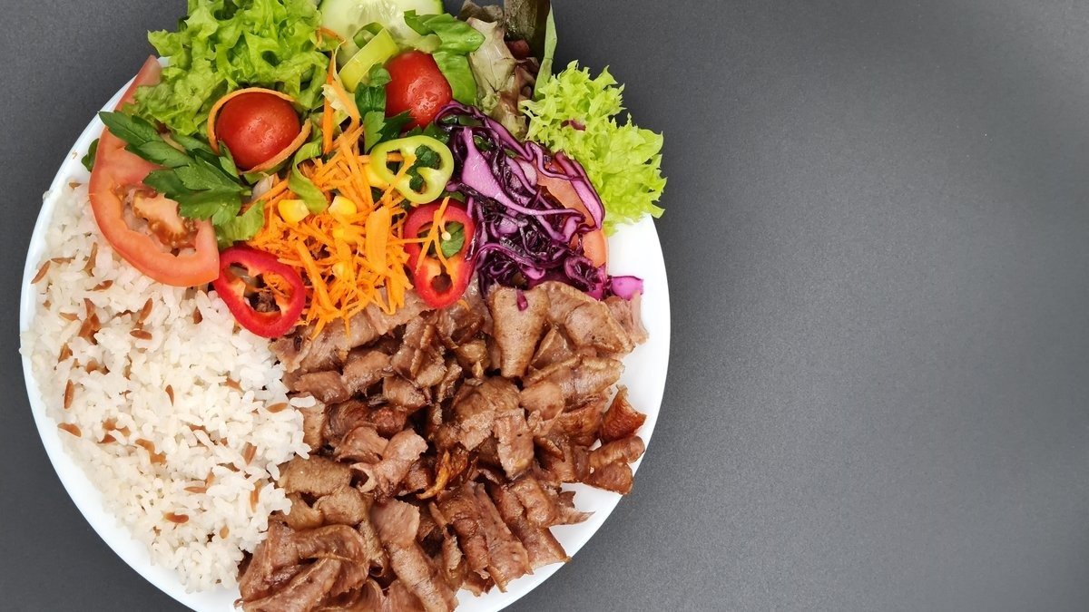 Riisillä ja ranskalaisilla. Valitse kana tai nauta döner.