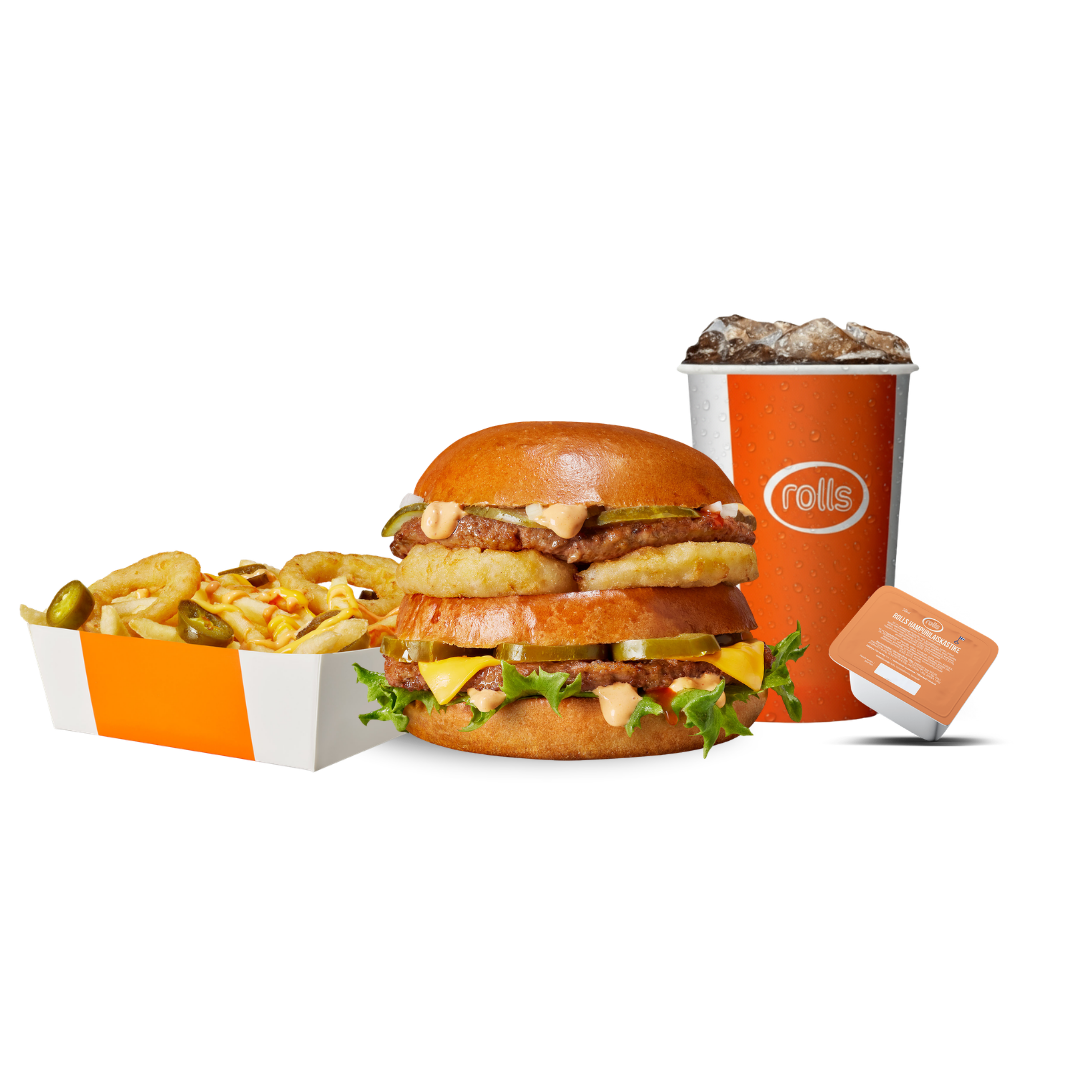 Kaikkien hampurilaisten äiti. Rakastetuin hampurilaisemme isommassa koossa. Jättisesamsämpylä 85g, iso hampurilaispihvi 113g x 2 kpl, Rolls-pihvimauste, cheddar-juustoviipale, suolakurkkuviipale, jäävuorisalaatti, sipulikuutiot, Rolls-majoneesi, Heinz-ketsuppi