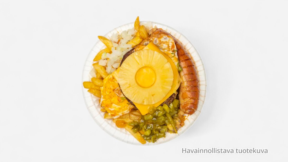 isot ranskalaiset, kokolihapihvi, kananmuna, 2x nakki, cheddarjuusto, ananas
