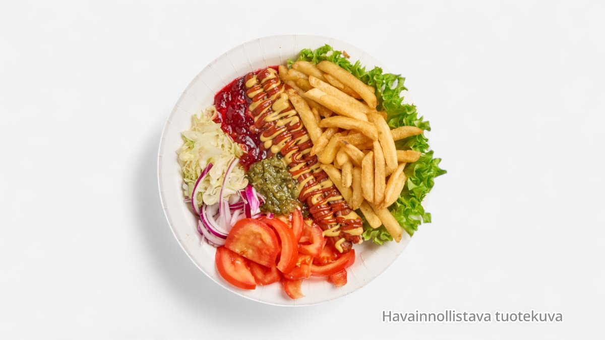 Isot ranskanperunat, lihis, 2 nakkia, kananmuna, salaattia, tomaattia, salaattikastike, ketsuppi, sinappi.