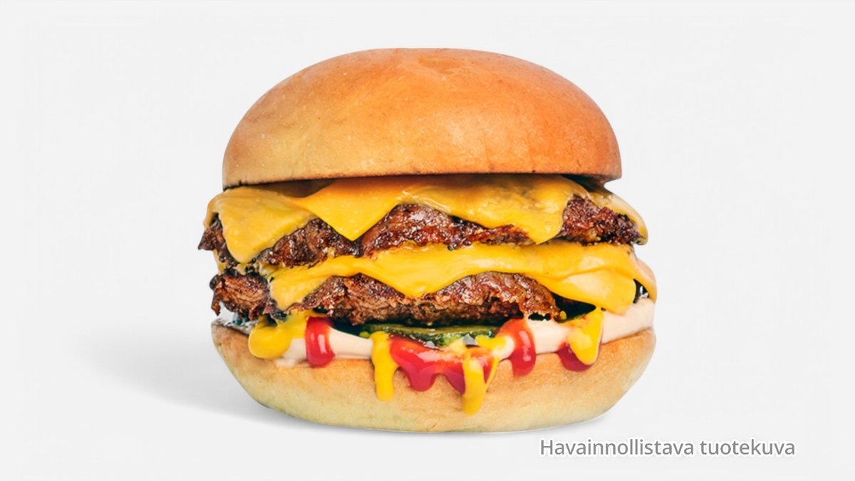 2 pihviä, grillattu sipuli ja tomaatti, kanamuna, salaatti, 2 cheddarjuustoa, burgerkastike