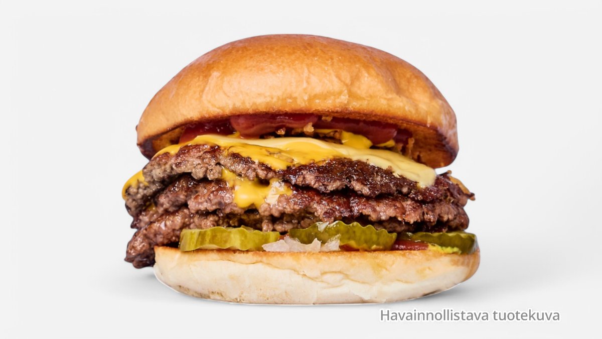 3 pihviä, grillattu sipuli ja tomaatti, salaatti, burgerkastike, 3 cheddarjuustoa