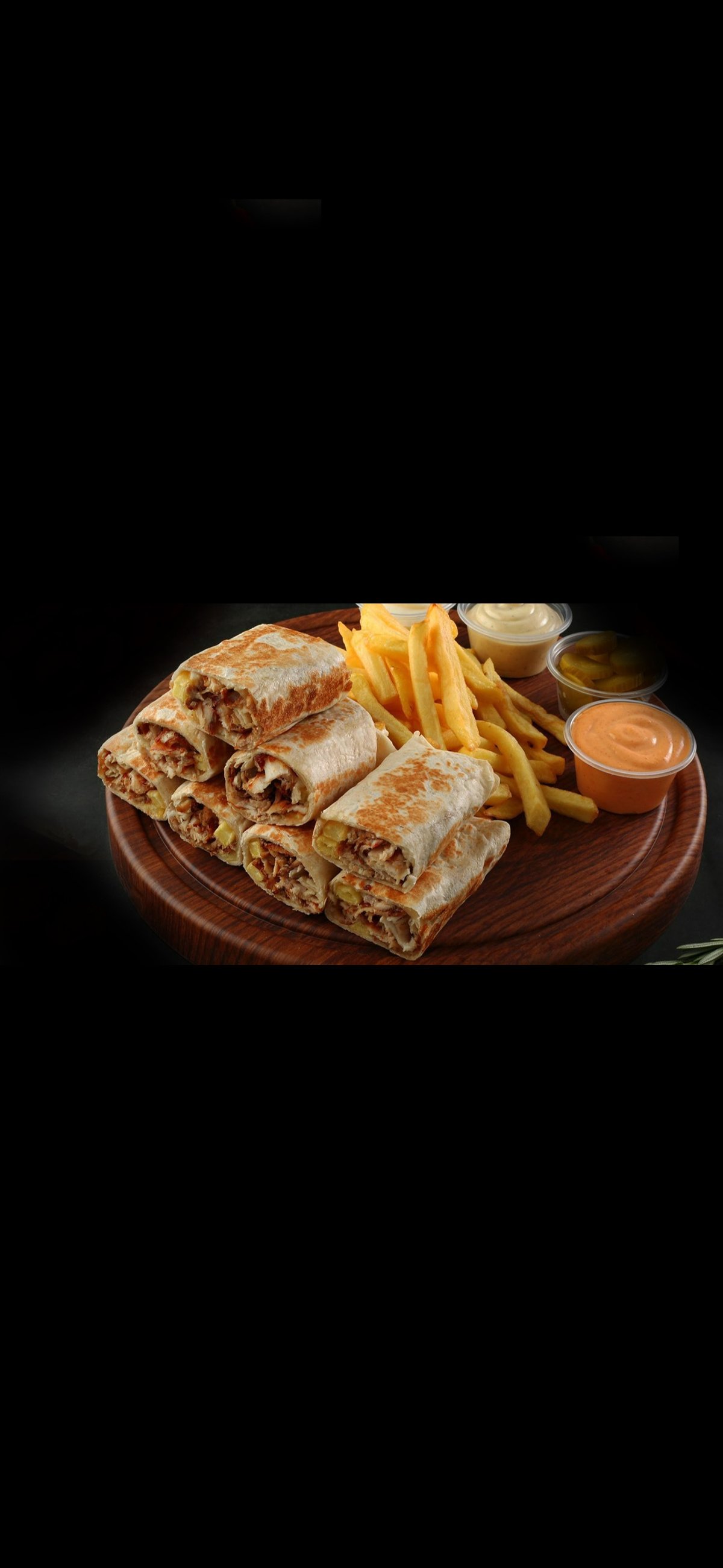 X2 tortilla , x2kebab , grillattu(paprika), ranskalaiset , Aurajuusto , kebab kastike, valkosipuli majoneesi+ valosipuli dippi+ 0.33 juoma