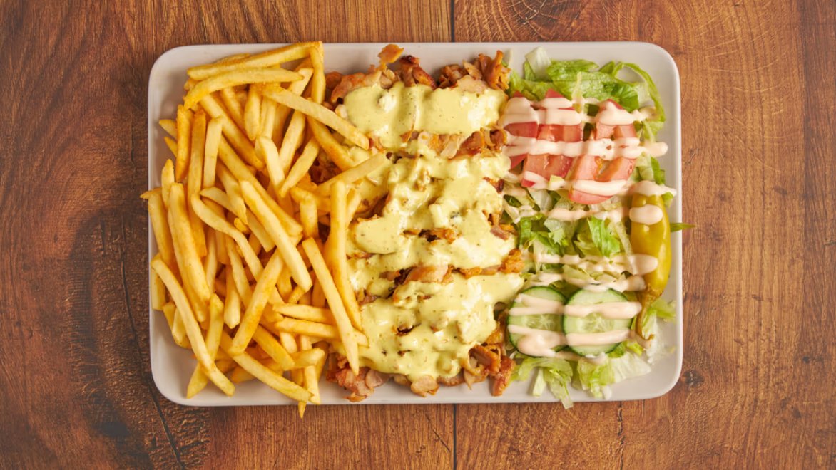 Kanakebab, 1/½ tortilla, ranskalaiset, fetajuusto , valkosipulimajoneesi , curry majoneesi , valkosipuli dippi