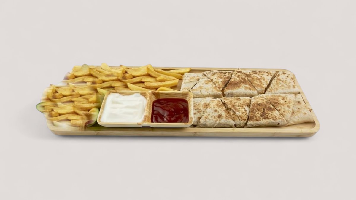 Grillimix (maissi, paprika, herkkusieni, grillimausteet), broileri, kanakebab , ranskalaiset, 1/½ tortilla, valkosipulimajoneesi, curry-majoneesi, juusto) valkosipuli dippi. 0.33 juoma