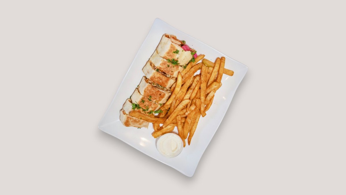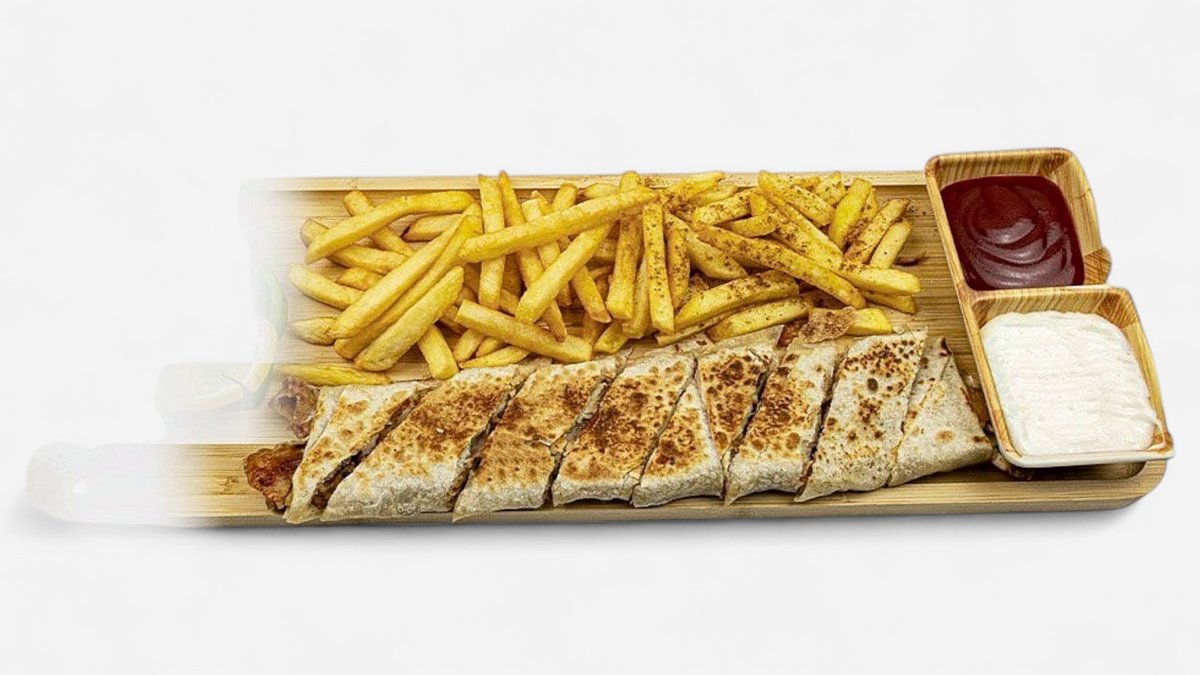 Kebab, 1/½ tortilla, kebab kastike, valkosipuli majoneesi, ranskalaiset + valosipuli dippi