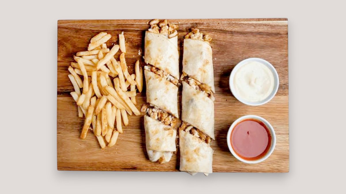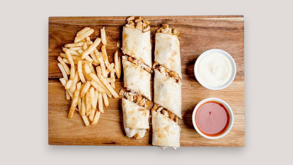 x2 tortilla , x2 kanakebab , aurajuusto ,maissi, ranskalaiset, valkosipuli majoneesi, curry majoneesi , valkosipuli dippi + 0.33 juoma
