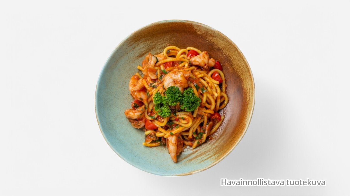 Pasta, tonnikala, simpukka, katkarapu.