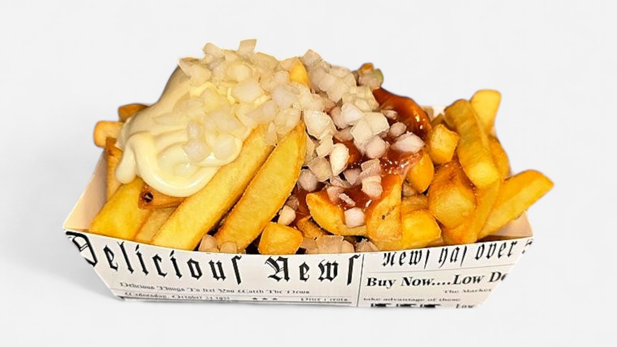 Ranskalaiset perunat, majoneesi, erikoiskastike ja sipuli.