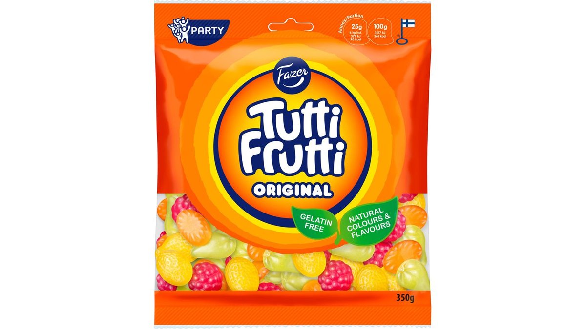 Hedelmäinen Tutti Frutti tuo iloa ja aurinkoa kaikille. Tutti Frutti Original on pirteä sekoitus hedelmäisiä makuja: vadelmaa, päärynää, sitruunaa ja uniikkia Tutti Fruttia. Aito ja alkuperäinen hedelmäkarkki on luontaisilla väreillä valmistettu, gelatiiniton ja vegaaninen. Raikkaan makunsa se saa luontaisista aromeista. Nauti karkkipussi yksin tai yllätä ystävät!