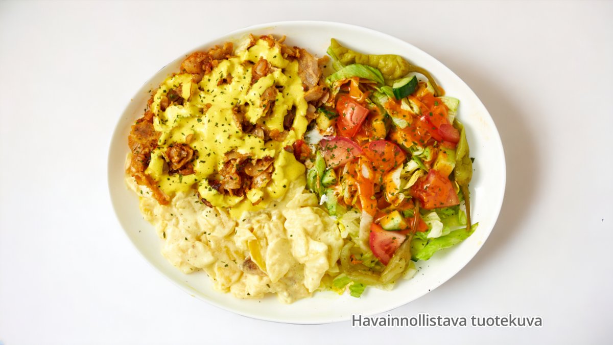 kebabliha, sipuli, ranskalaiset, salaatti, majoneesi