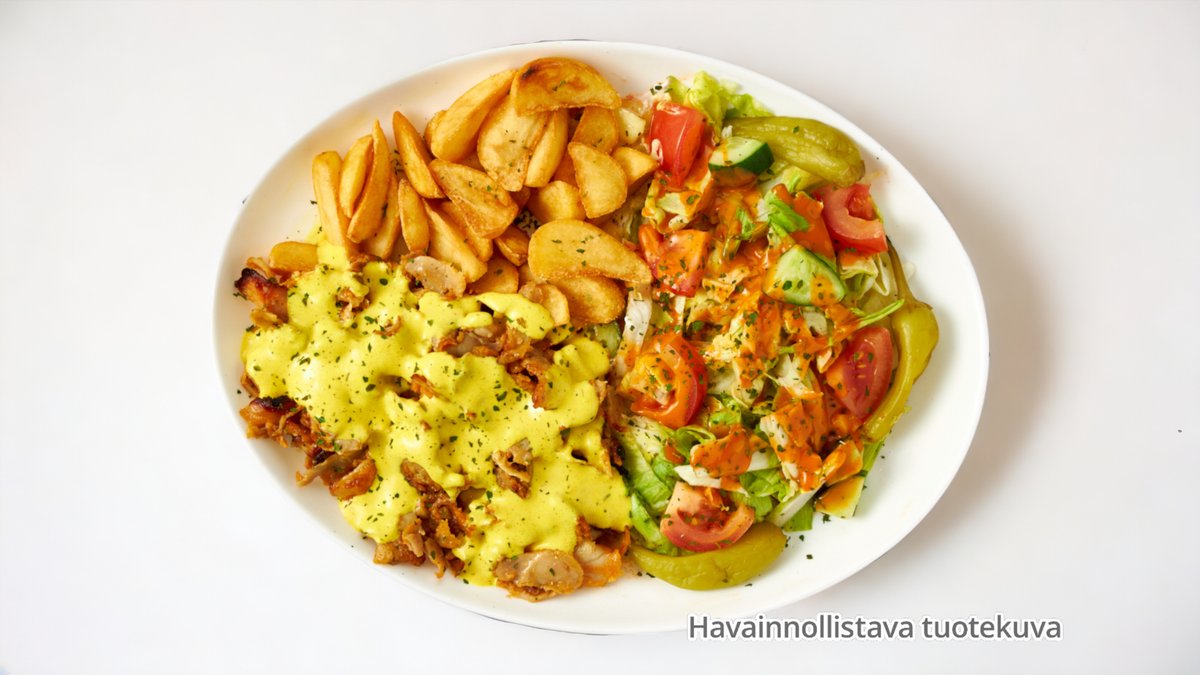 kebabliha, kurkku, ranskalaiset, sipuli, tomaatti, jogurttikastike
