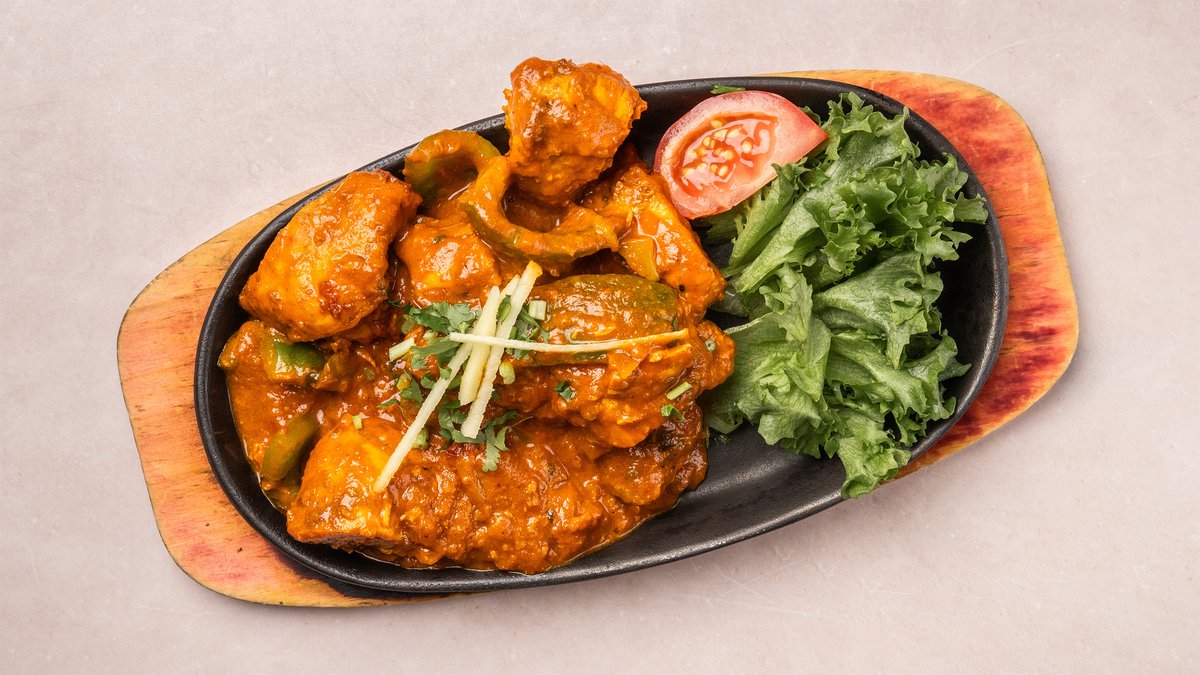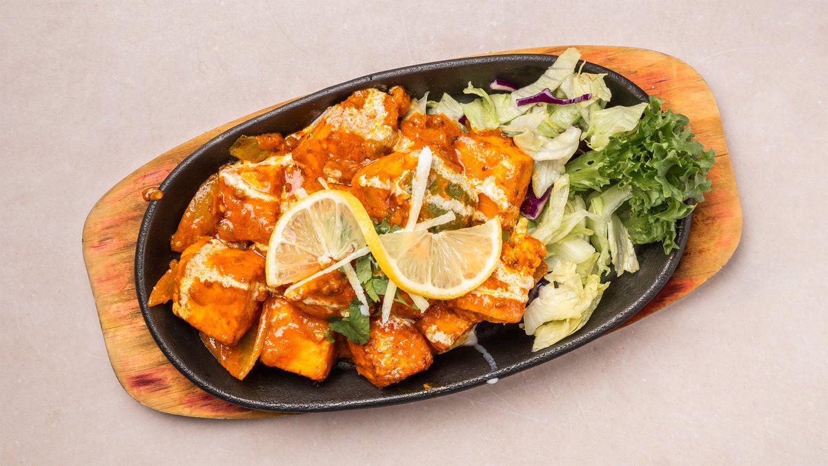 Rapeaksi paistettu paneer wokataan paprikan ja sipulin kanssa ja kiedotaan kirkkaaseen tomaatti–chilikastikkeeseen. Inkiväärin ja valkosipulin lämpö, chilin napakka potku – tulisuutta voidaan säätää. Kasvis | Sisältää maitoa