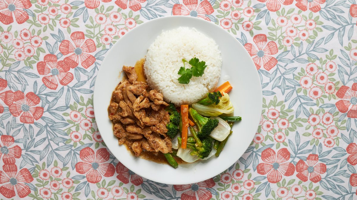 Steamed rice with stir-fried tofu, mushroom and veggies