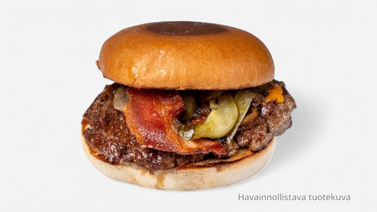 BBQ-majoneesi, maustekurkku, salaatti, pihvi, juusto, pekoni