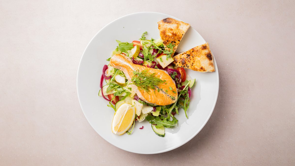 Paistettua lohta, salaatteja, kirsikkatomaattia, marinoitua punasipulia, kurkkua, päärynää, vinaigrette kastike sekä talon leipää