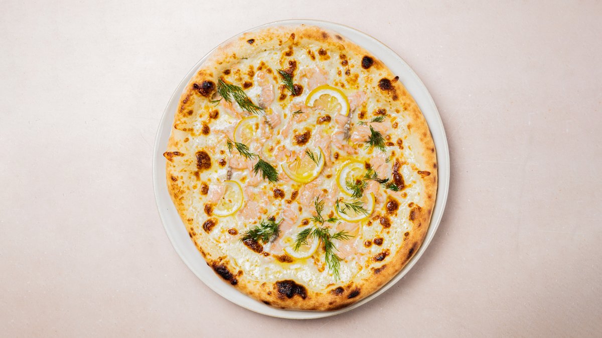 Mozzarella, creme fraiche, kesäkurpitsa, sitruunamarinoitu lohi, ruohosipuli