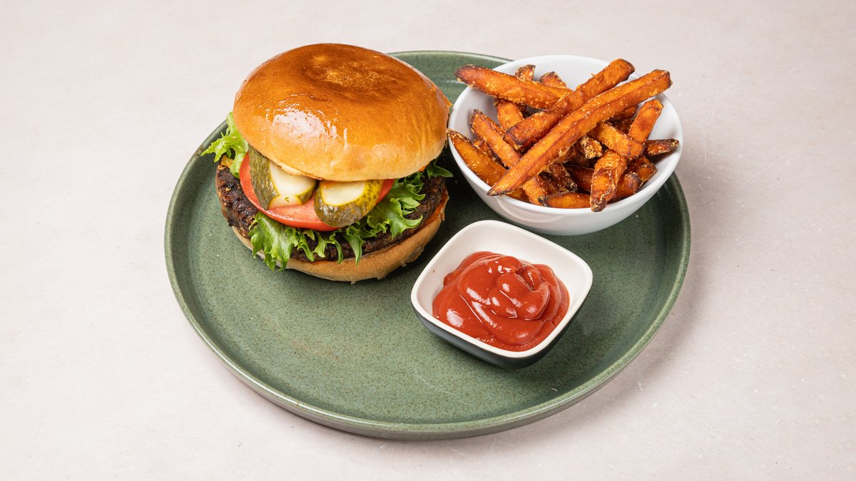Talon mustapapukikhernepihvi, salaattia, tomaattia, herkkukurkkua, paahdettua sipulia, romesco kastiketta sekä bataattirankalaiset (sis. pähkinää)