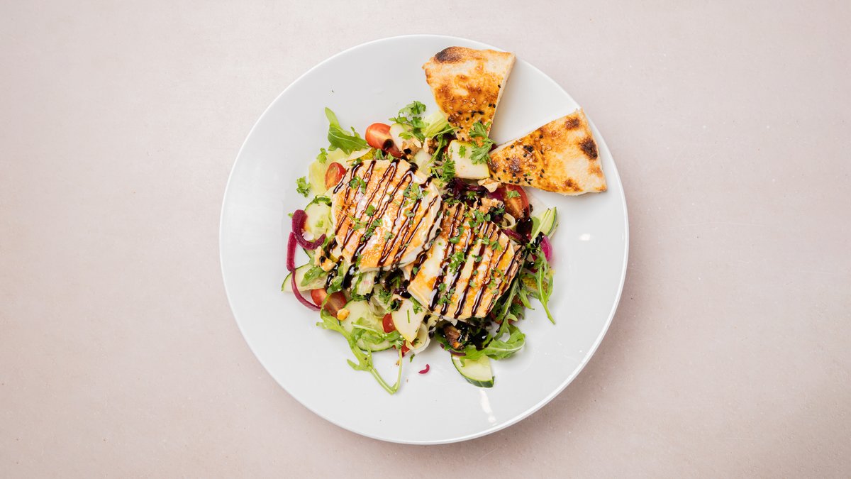 Paahdettua vuohenjuustoa, salaatteja, kirsikkatomaattia, marinoitua punasipulia, kurkkua, saksanpähkinöitä ja balsamico kastiketta sekä talon leipää