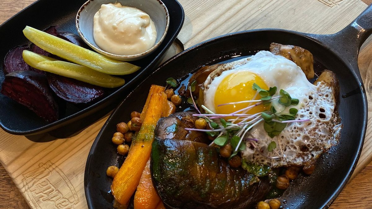 Paistettua portobelloa, pippurikermassa paahdettua perunaa, häränsilmäksi paistettu kananmuna, rapeita kikherneitä, paahdettua porkkanaa, punajuurta, maustekurkkua sekö valkosipulidippi.
