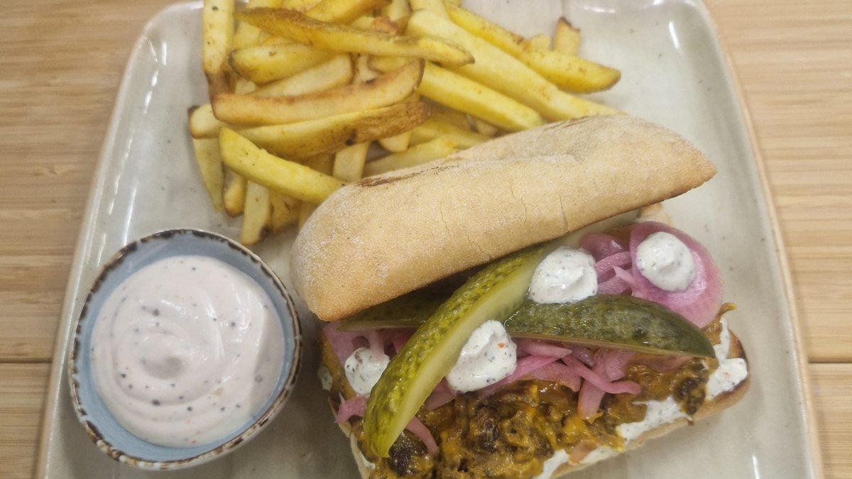 Ciabatta leivän välissä grillattua halloumia, raikasta chimichurri-jogurttia, marinoitua punasipulia ja papuja. Tarjoillaan maustettujen maalaisranskanperunoiden ja talon ranch-dipin kera.