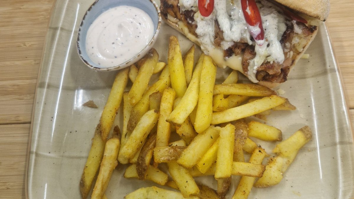 Ciabatta leivän välissä ylikypsää härän niskaa, Café de Paris -kastiketta, marinoitua punasipulia sekä maustekurkkua. Tarjoillaan maustettujen maalaisranskanperunoiden ja talon ranch-dipin kera. *Kastike sisältää kalaa.