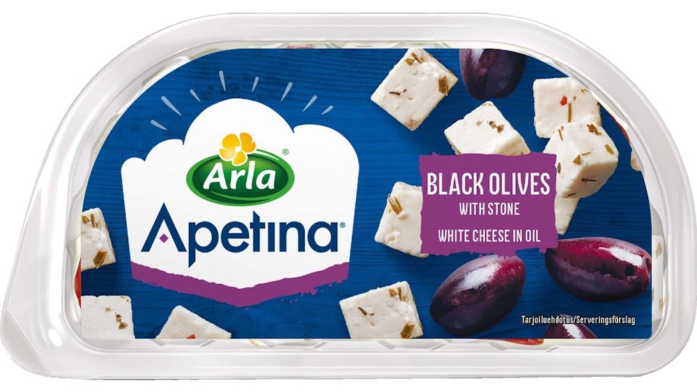 Arla Apetina 100/60g snack välimerellinen juusto kuutioina ja mustia oliiveja ölymarinadissa.