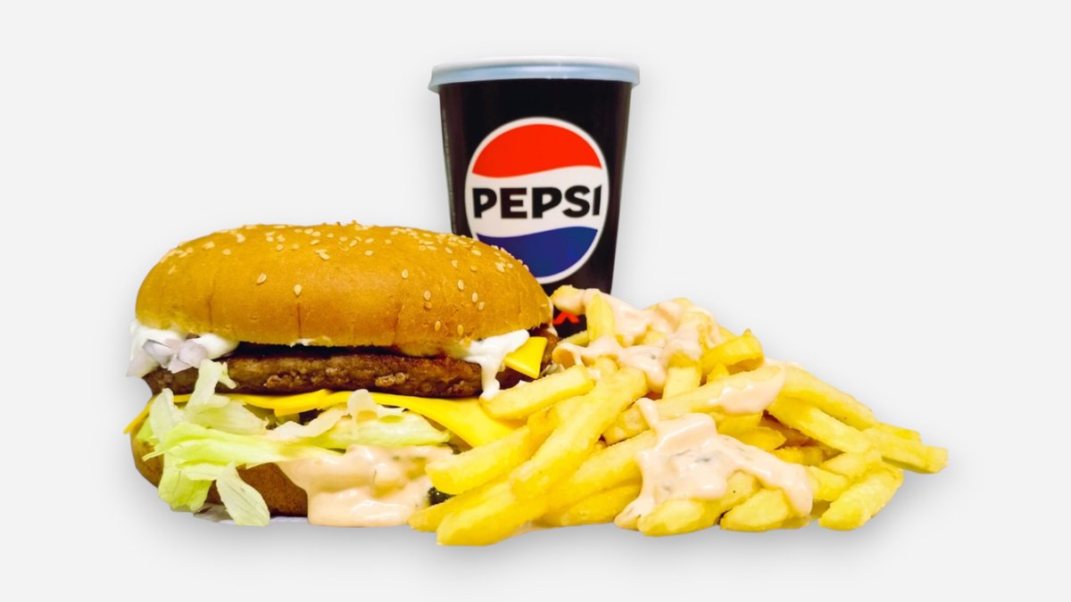 2x125g täyslihapihvi, sinappi, ketsuppi, sipuli, cheddarjuustoa kurkkusalaatti, salaatti, amerikankastike