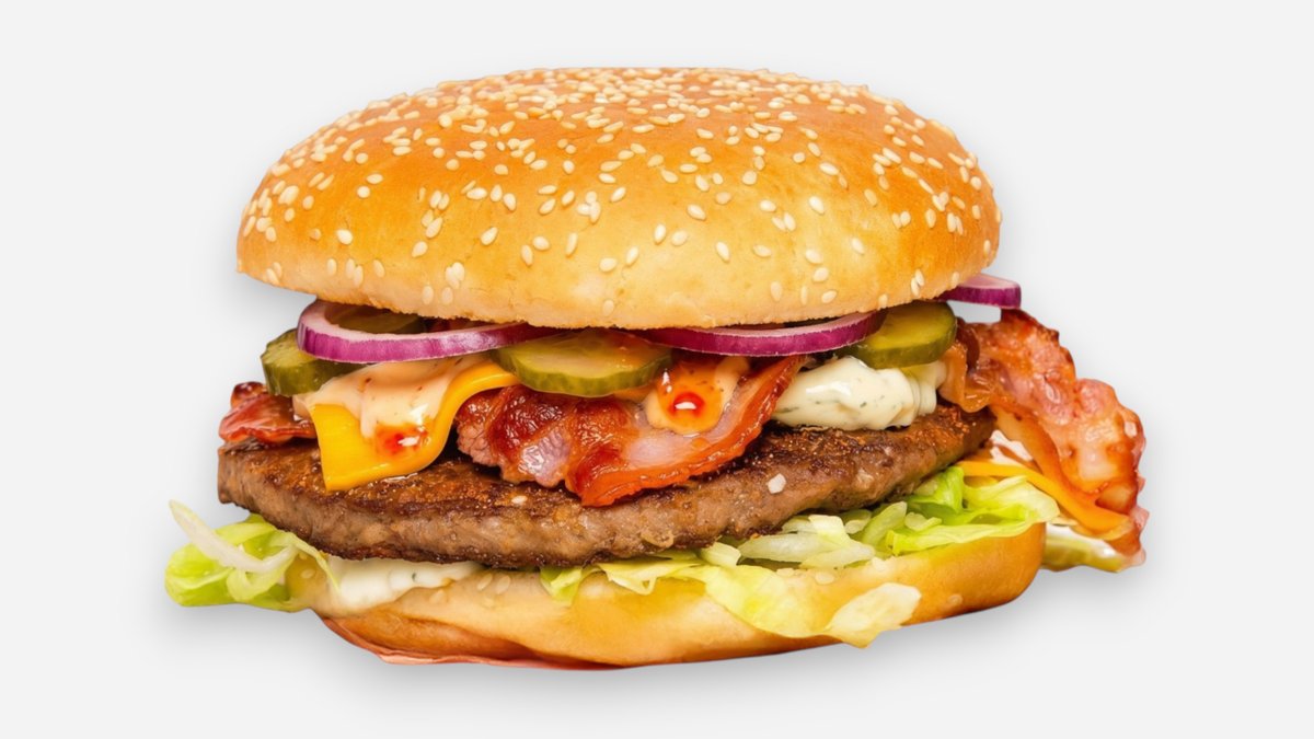 130g jauhelihapihvi, pekoni, juusto, tomaatti, sipuli, salaatti, savuchilimajoneesi