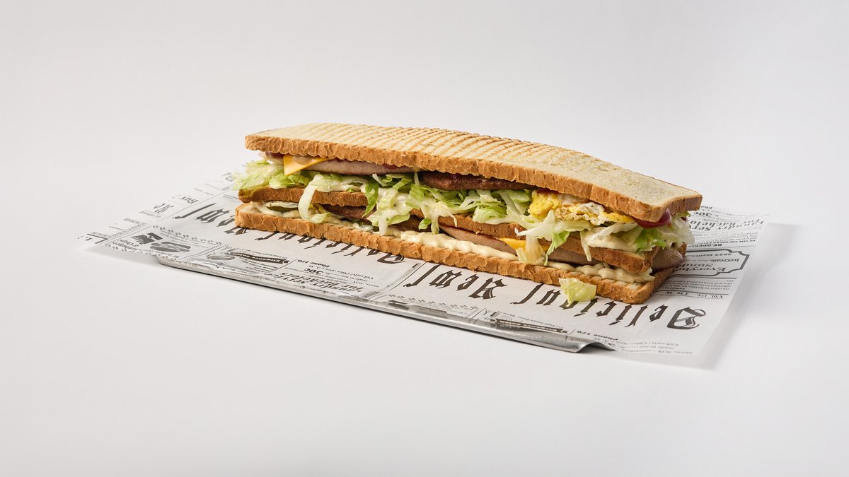 Homestyle-kerrossämpylä, 2x kokolihapihvi, pekoni, 2x cheddarjuusto, salaatti, tomaatti, ketsuppi, sipuli, maustekurkku, rocket-kastike