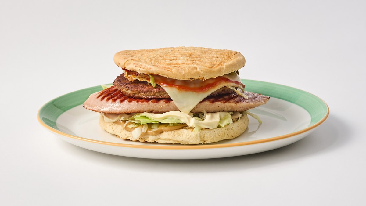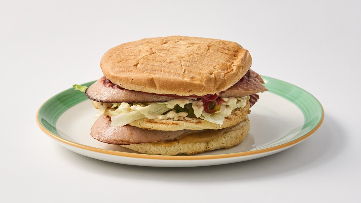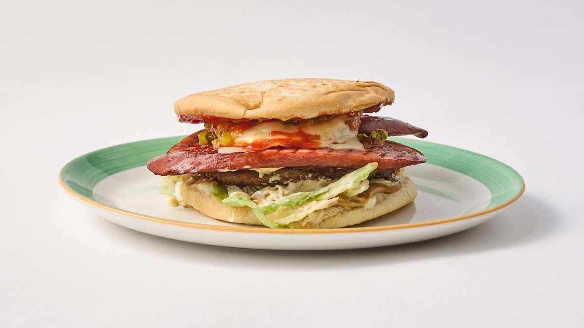 Perinteinen sämpylä, jauhelihapihvi, kaiserwursti, muna, juusto