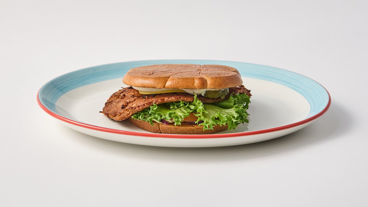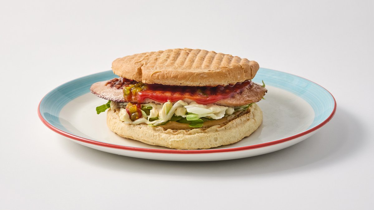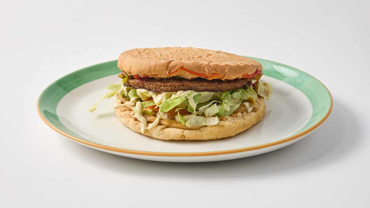 Special sämpylä, vegepihvi, vegejuusto, vegekastike, salaatti, tomaatti, maustekurkku, sipuli