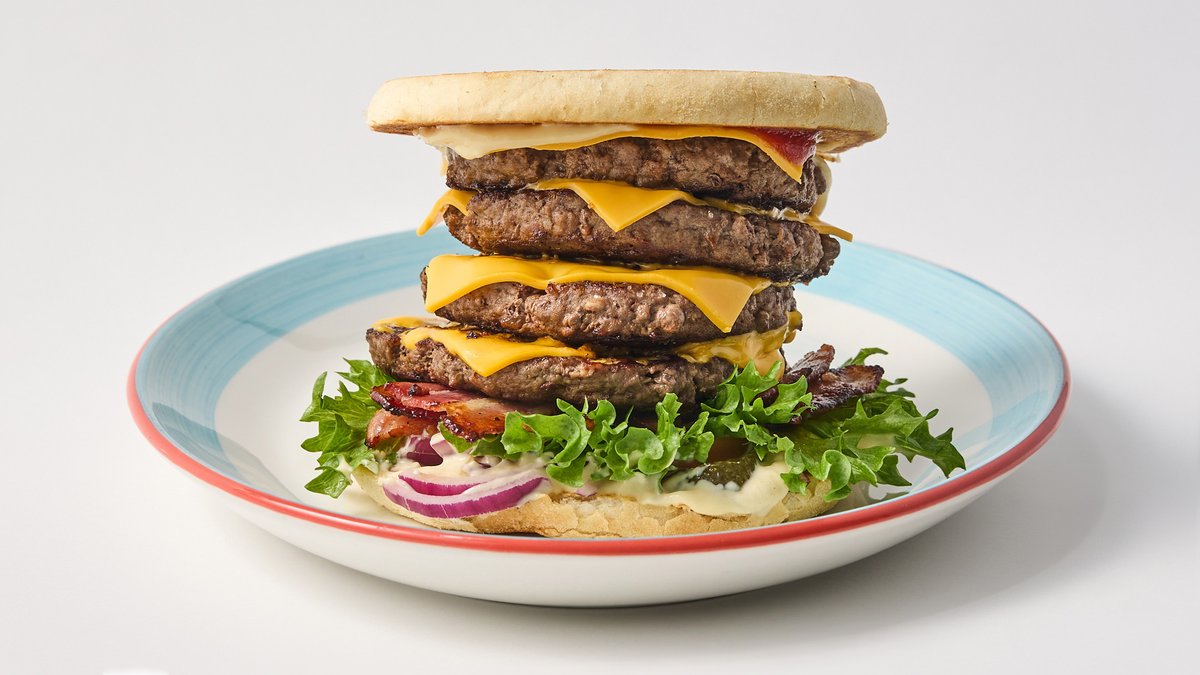 Homestyle-sämpylä, 4x kokolihapihvi, pekoni, 4x cheddarjuusto, salaatti, tomaatti, ketsuppi, sipuli, maustekurkku, rocket-kastike