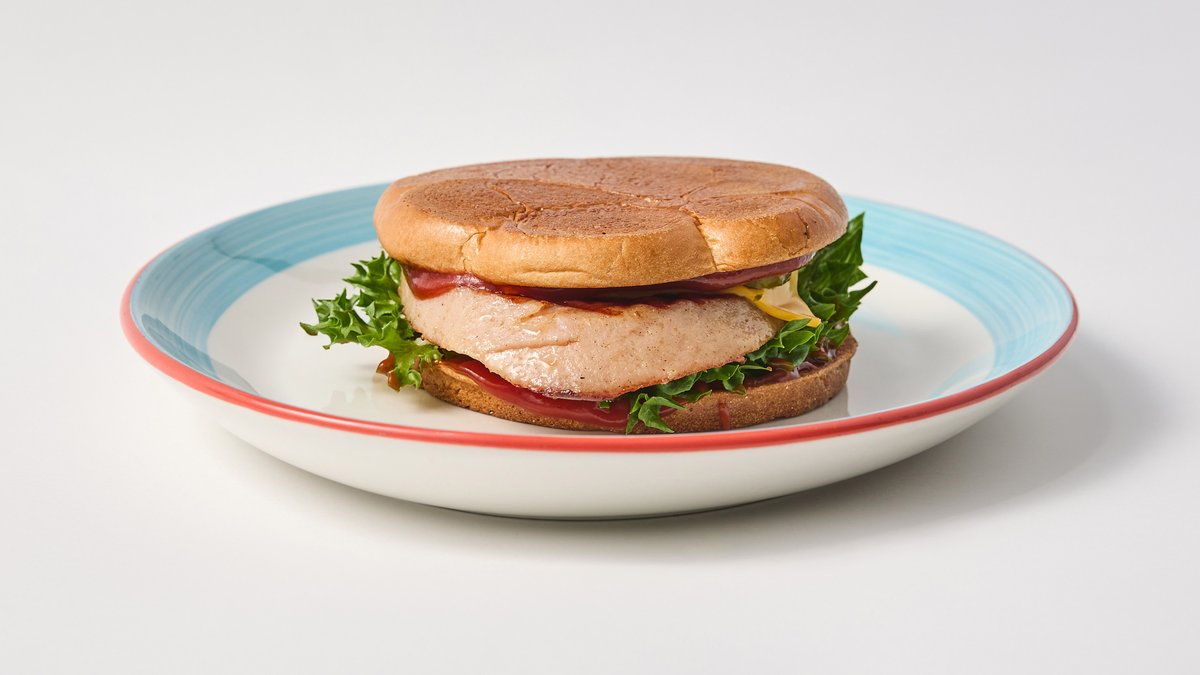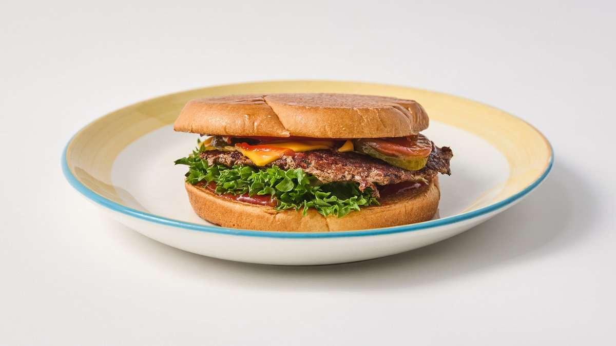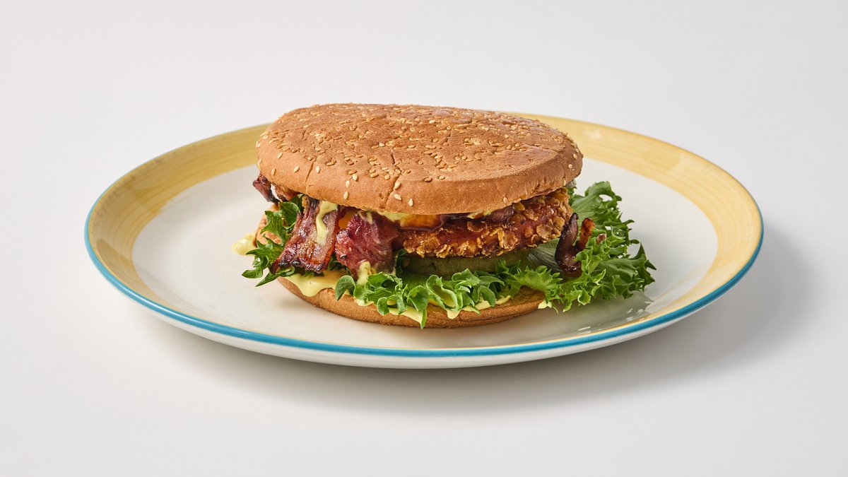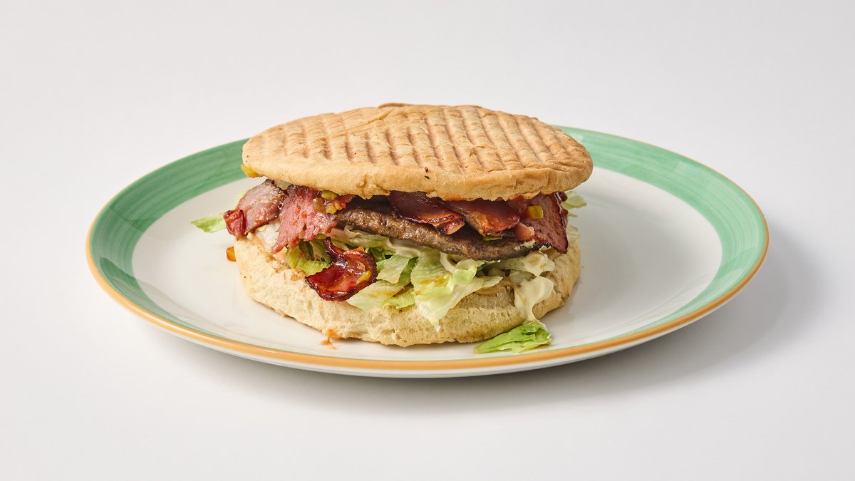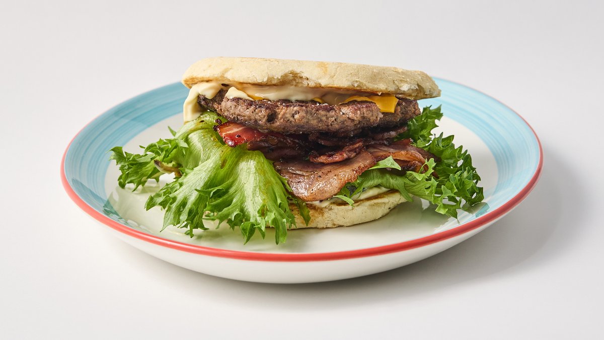 Perinteinen sämpylä, kokolihapihvi, pekoni