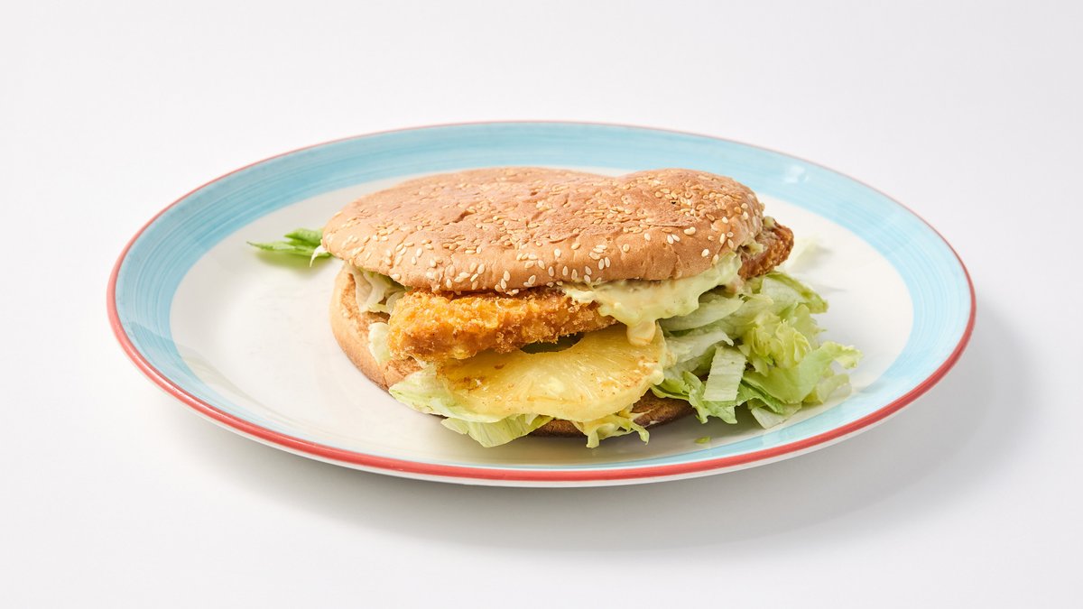 Seesamsämpylä, kanapihvi, cheddarjuusto, ananas, currykastike, salaatti, tomaatti, maustekurkku
