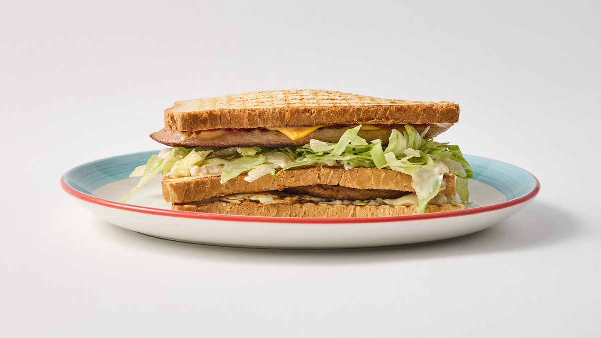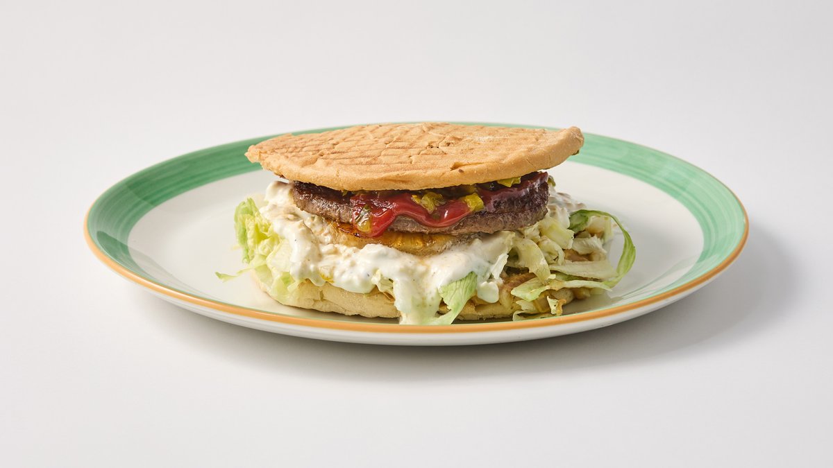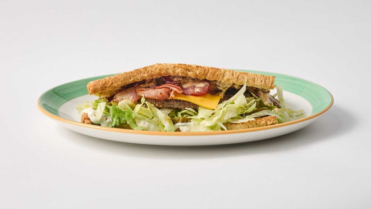 Vuokaleipäsiivut, jauhelihapihvi, berliininmakkara, muna, cheddarjuusto, sinappi, ketsuppi, maustekurkku, sipuli, salaatti, remoulade-ja talonkastike
