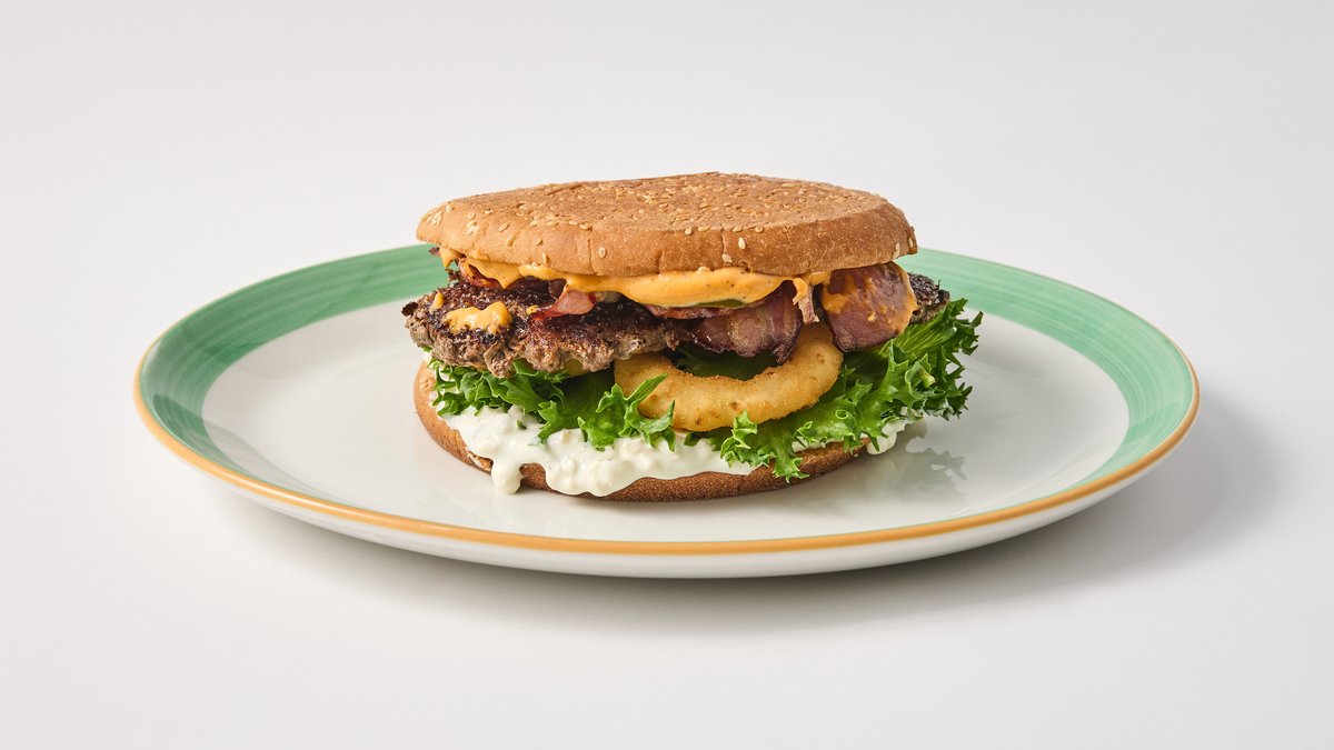Seesamsämpylä, kokolihapihvi, pekoni, sipulirenkaat, special-kastike, aurajuustokastike, tomaatti, maustekurkku