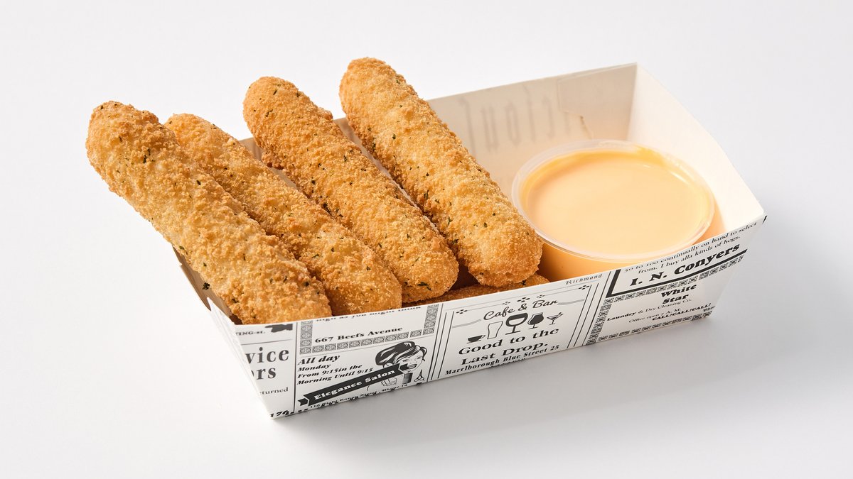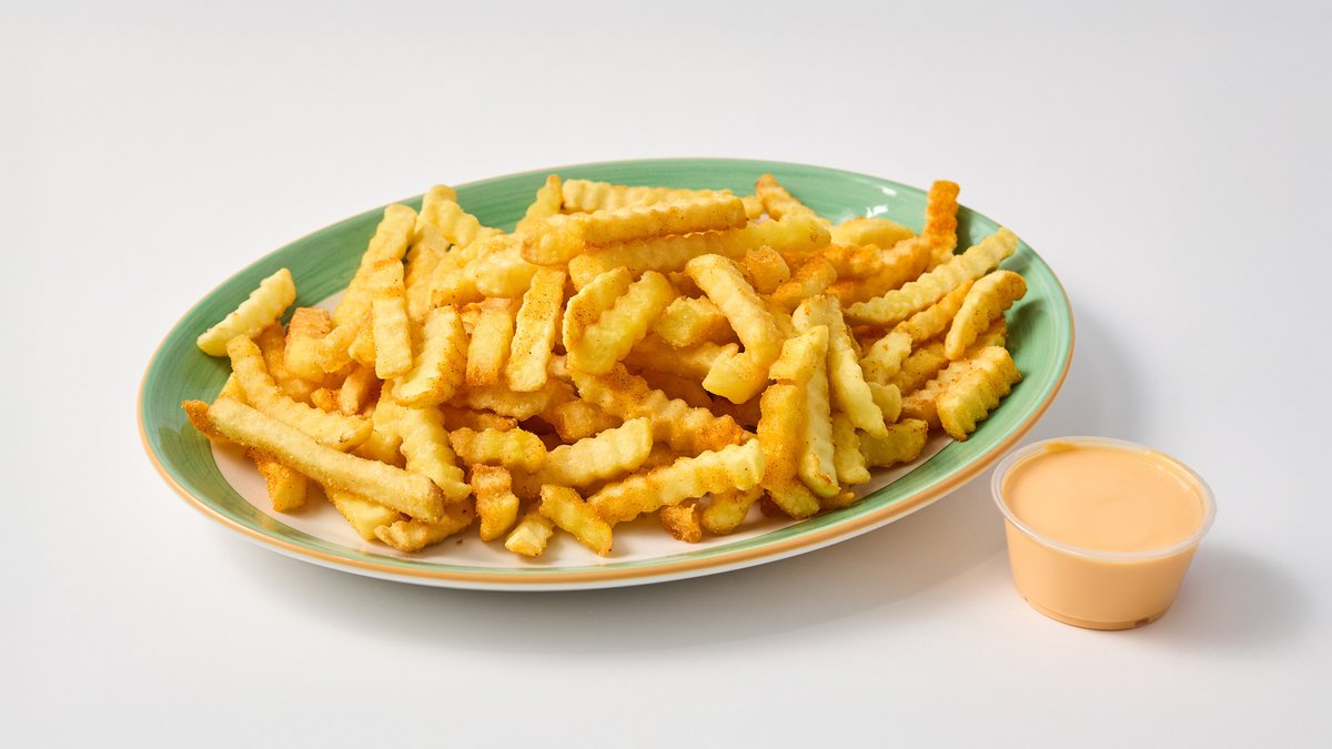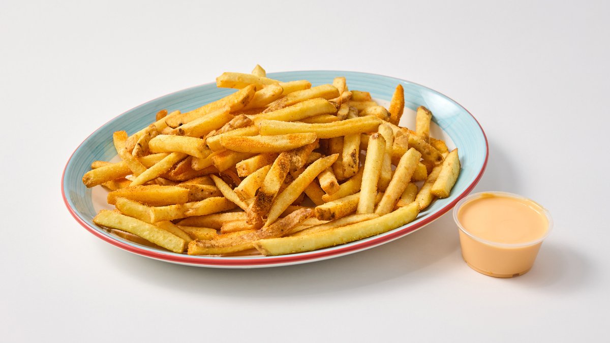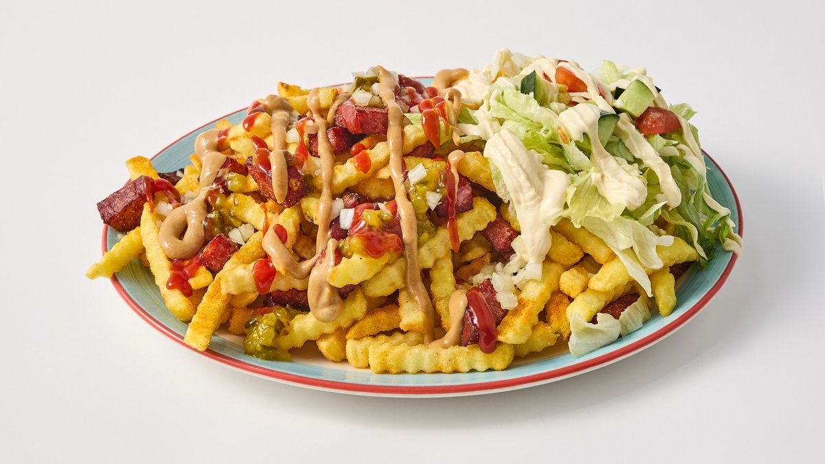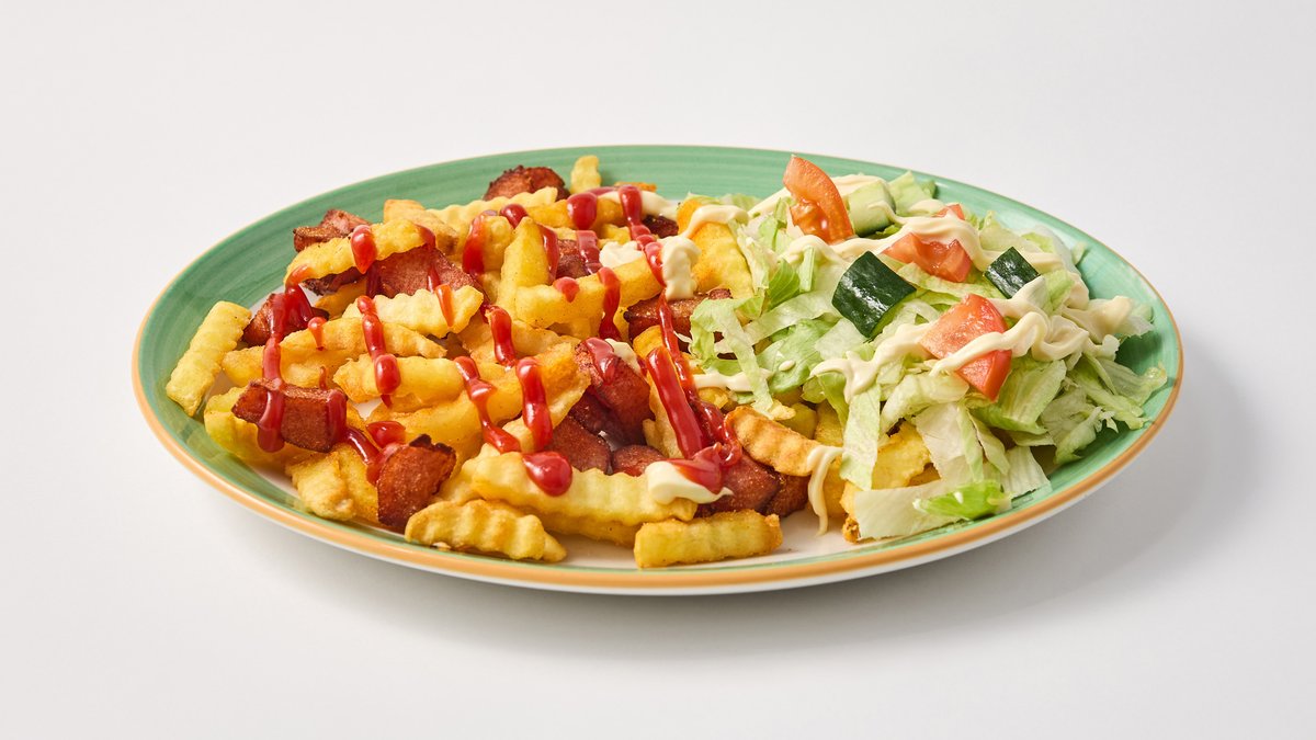 Ranskanperunat, makkarakuutiot, ketsuppi, salaatti, kastike