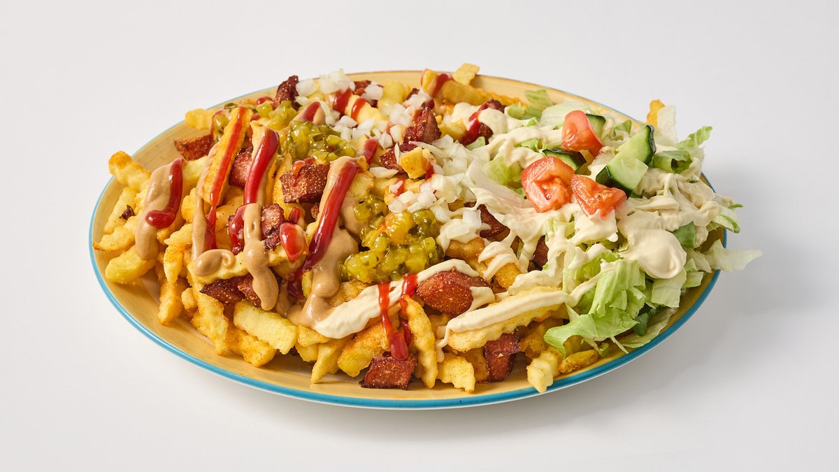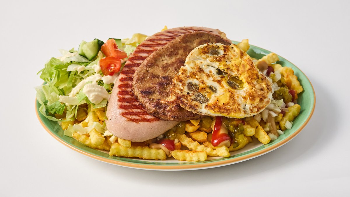 Ranskanperunat, jauhelihapihvi, berliininmakkara, kananmuna