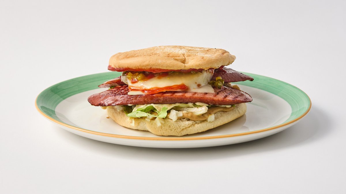 Perinteinen sämpylä, kokolihapihvi, aurajuustokastike, ananas