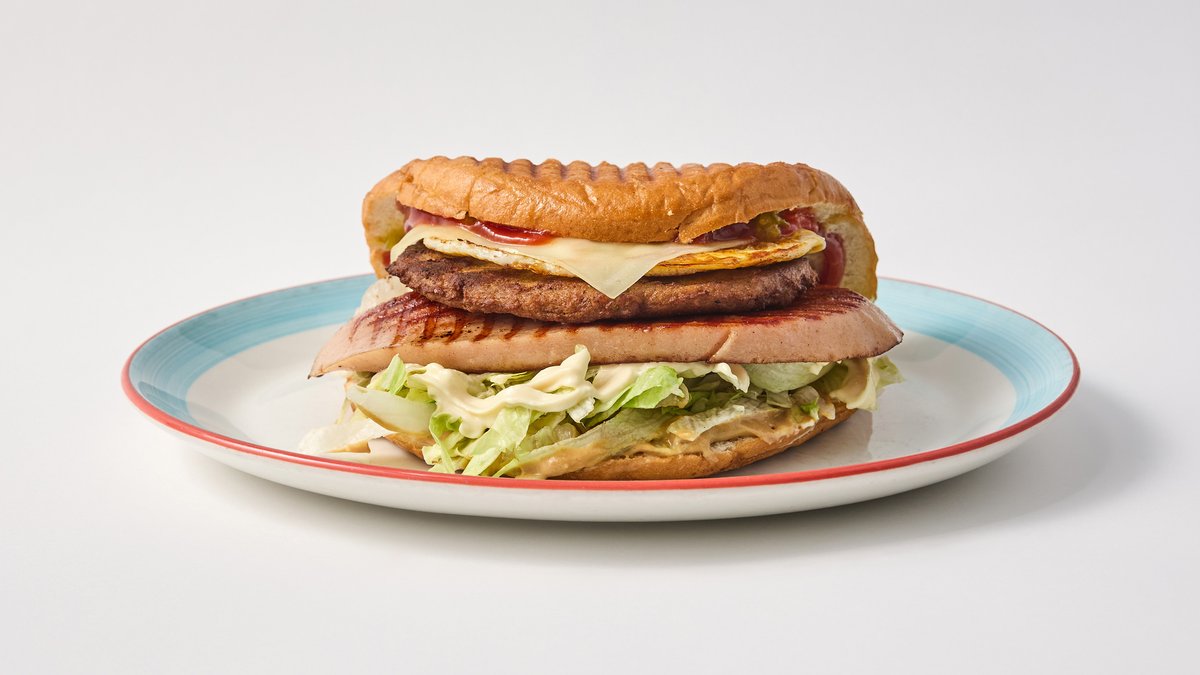 Perinteinen sämpylä, jauhelihapihvi, berliininmakkara, muna, juusto