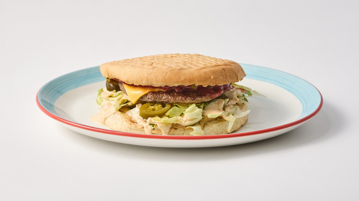 Perinteinen sämpylä, kokolihapihvi, jalapenot, chilimajoneesi, cheddarjuusto